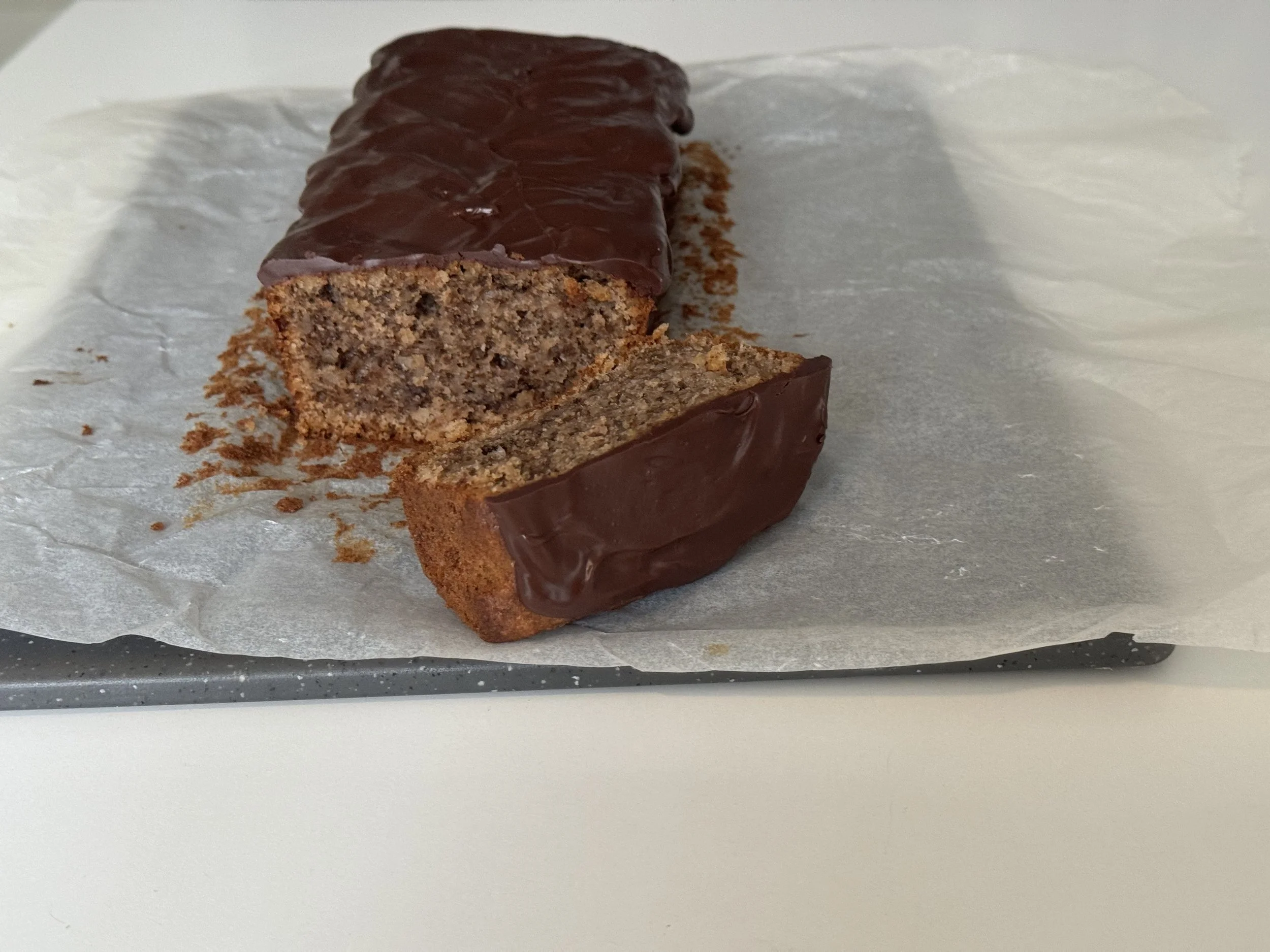 Once your cake is cooled down, melt 60g of dark chocolate with 15g of butter and spread evenly over your loaf.